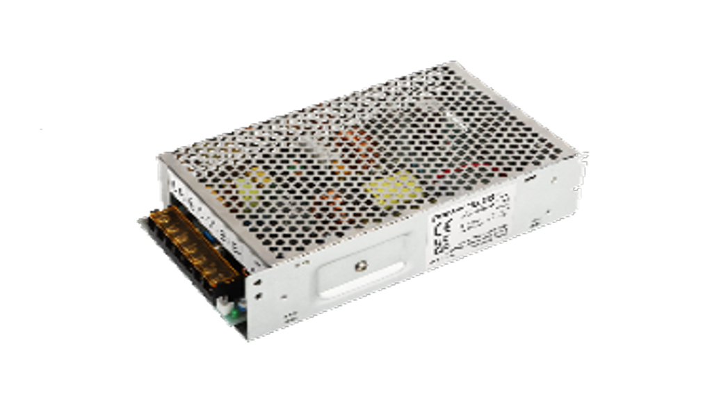 Alimentatore in contenitore metallico a griglia, Security&UPS, tensione ingresso da 110 a 240 Vca e da 124 a 370 Vcc, tensione di uscita 1: 54 Vcc, 2,7A, uscita 2: 53,5 Vcc, 0,2A. Segnalazioni sovraccarico/tensione elevata/corto circuito/batteria bassa/protezione polarità batteria. Conforme CE, EMC, ROHS, REACH, UKCA. Dimensioni in millimetri: 110 x 199 x 50.