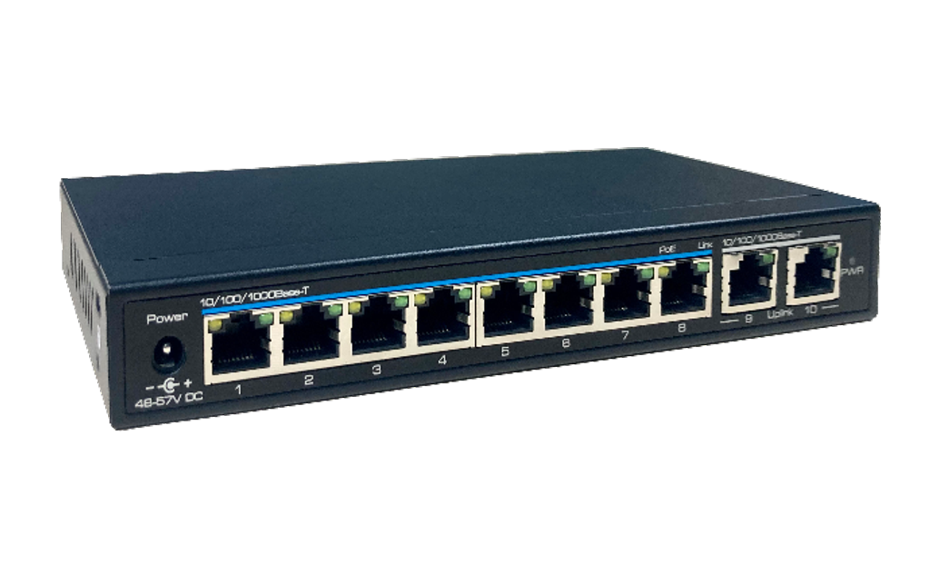 Switch ethernet unmanaged 8 porte RJ-45 Gigabit PoE+, 2 porte uplink Gigabit SFP, in grado di fornire alimentazione PoE con